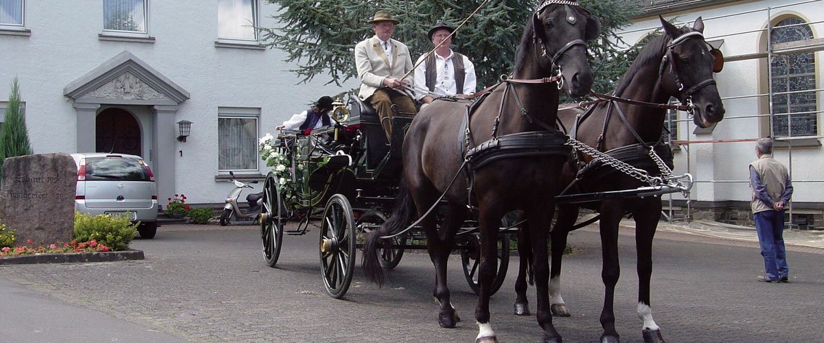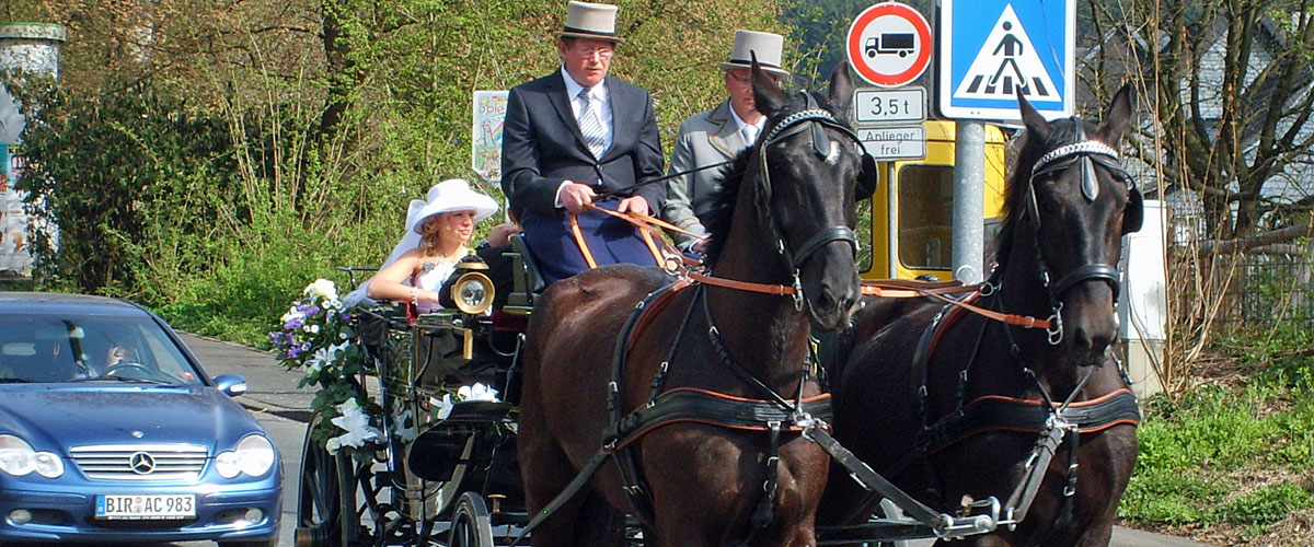 Bei einer romantischen Fahrt mit einer historischen Landauer Kutsche, edlen Orlof-Trabern oder starken Kaltblütern können jung vermählte Paare, Silber- und Goldhochzeitspaare den Alltag vergessen und diesen Tag zum schönsten ihres Lebens werden lassen.